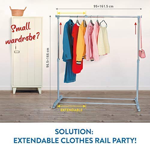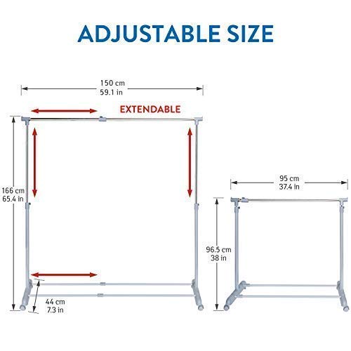 De afmetingen van het kledingrek bedragen 95 x 44 x 96,5 cm (wanneer het ingetrokken is) en max. 161,5 x 44 x 166 cm (in uitgeschoven).
