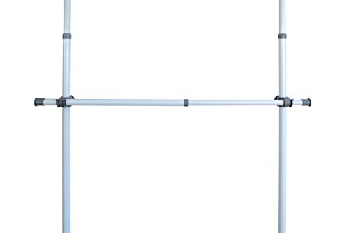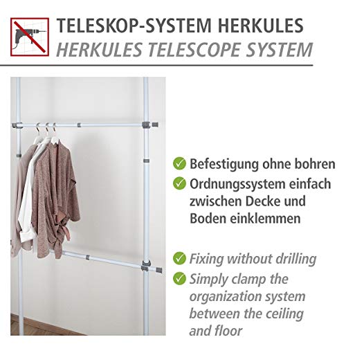 De horizontale stangen zijn van 75 – 120 cm uittrekbaar. Dankzij de hoogteverstelling is het complete telescopische systeem Herkules aan verschillende ruimtes aanpasbaar. De twee telescopische stangen worden geleverd inclusief houders en bieden met hun gepoedercoat metaal een zeer goede stabiliteit in bijzonder zware kwaliteit.
