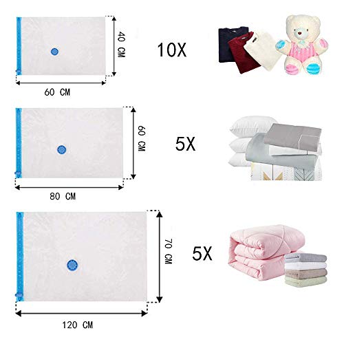 Inhoud pakket: 20 vacuümzakken in 3 verschillende maten voor kleding, dekbed enz. 5 stuks 70 x 120 cm, 5 stuks 60 x 80 cm, 10 stuks 40 x 60 cm, geschikt voor handmatige of elektronische luchtpomp.