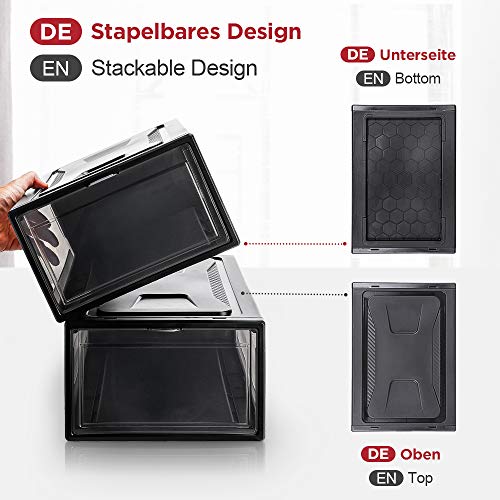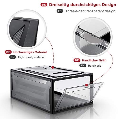 【Met grote inhoud + hoogwaardig materiaal】Elke doos is groot genoeg, alle schoenen tot maat 48 passen in deze dozen. De dozen zijn gemaakt van nieuw PP-materiaal, dat veilig, milieuvriendelijk en geurneutraal is. De wanden zijn dik genoeg, zodat de box niet zo gemakkelijk kan worden beschadigd. Hij heeft een hoge belastbaarheid en is bestand tegen druk en vervormingen.