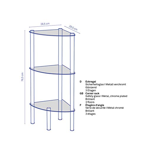 Kela 18050 Hoekrek, 3 schappen, metaal/doorzichtig glas, Ole, Verchroomd, Transparant, 28,5 x 28,5 x 76 cm